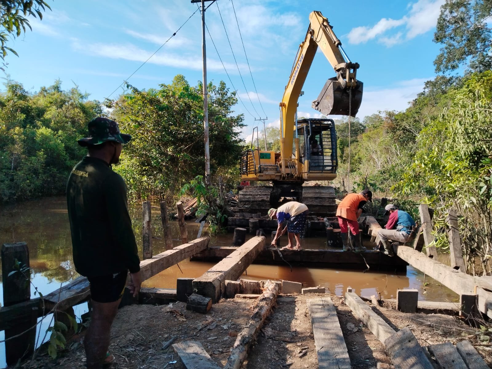 Proses pengangkutan semen dilakukan dengan semangat tinggi, melibatkan petugas lapangan dan warga desa. Setiap sak semen diangkat dan dibawa ke lokasi pengecoran secara estafet menggunakan berbagai alat bantu, menyesuaikan kondisi jalan yang belum sepenuhnya terbuka untuk kendaraan besar.