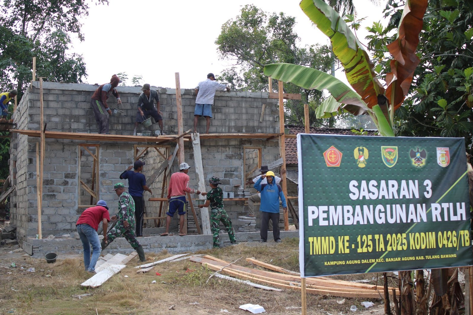 Tulang Bawang, 2 Agustus 2025 — Pembangunan Rumah Tidak Layak Huni (RTLH) dalam program TMMD ke-125 Kodim 0426/Tulang Bawang di Sasaran 3 Kampung Agung Dalam, Kecamatan Banjar Agung, terus mengalami kemajuan. Pada hari ini, pekerjaan difokuskan pada tahap pengecoran talang sebagai bagian dari penyempurnaan konstruksi atap.