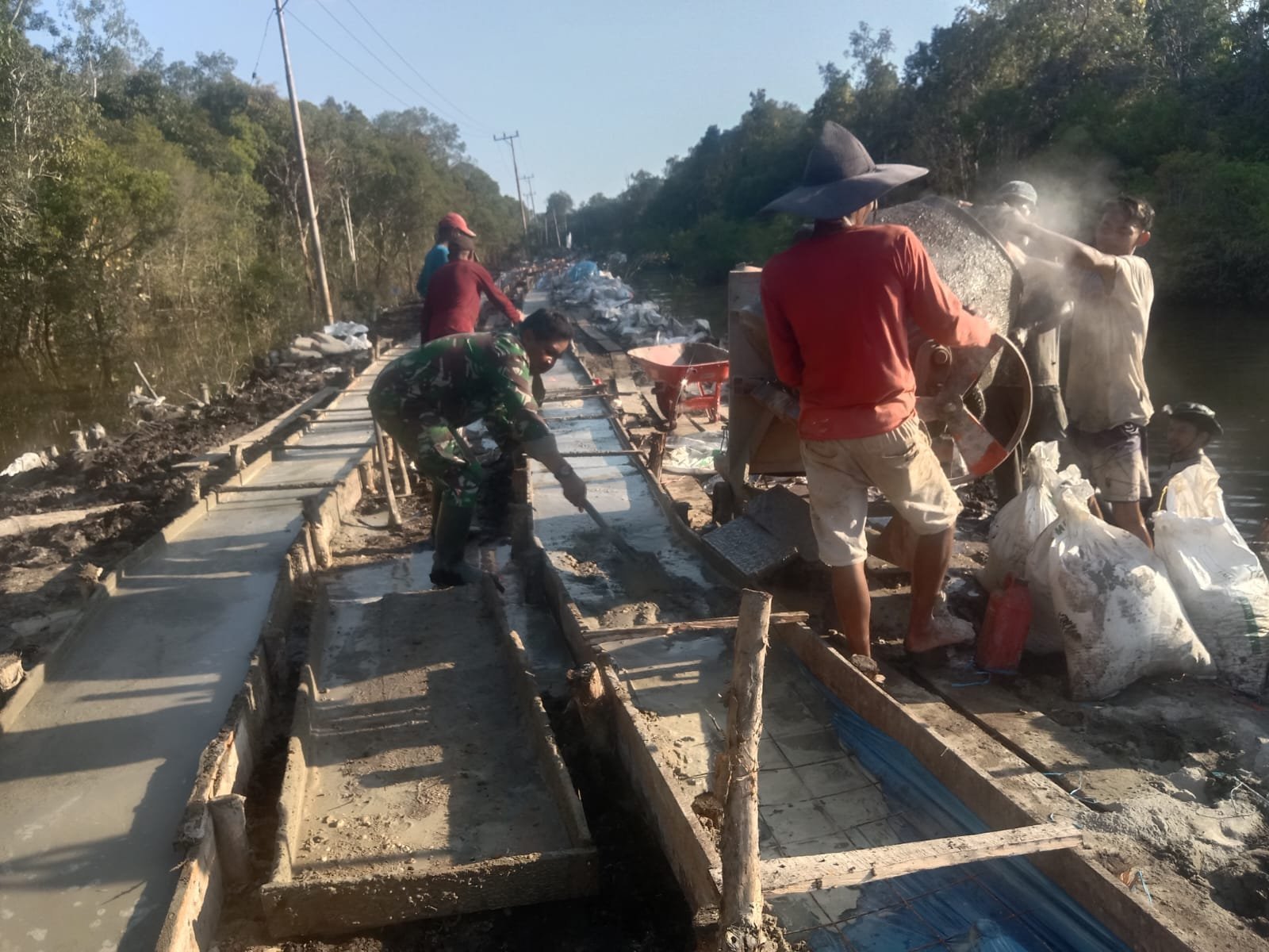 Prajurit TNI bersama warga setempat bahu-membahu melakukan perakitan besi tulangan sebagai bagian dari pembangunan infrastruktur desa. Proses ini menjadi tahapan penting untuk memperkuat struktur sebelum memasuki tahap pengecoran.