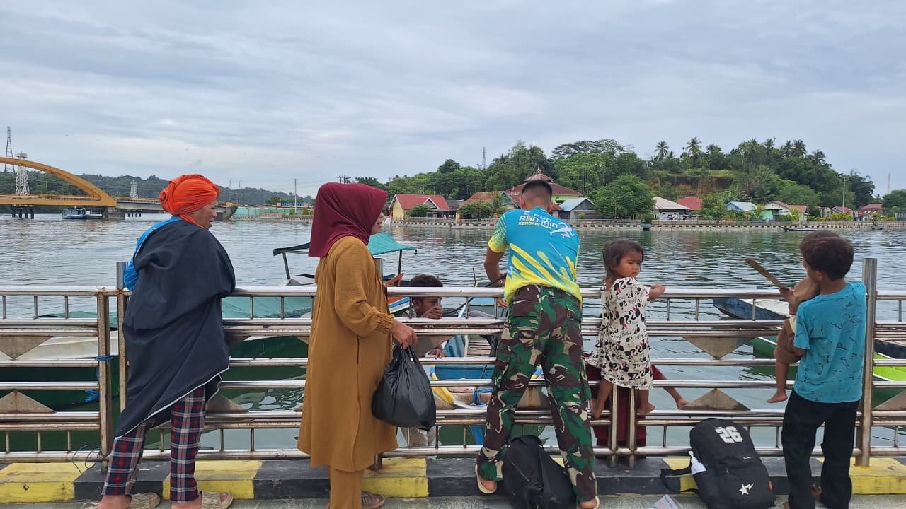 Di sela-sela pengerjaan sasaran fisik, sejumlah prajurit tampak membantu warga pesisir, termasuk anak-anak sekolah dan lansia, saat hendak menaiki perahu di dermaga setempat.