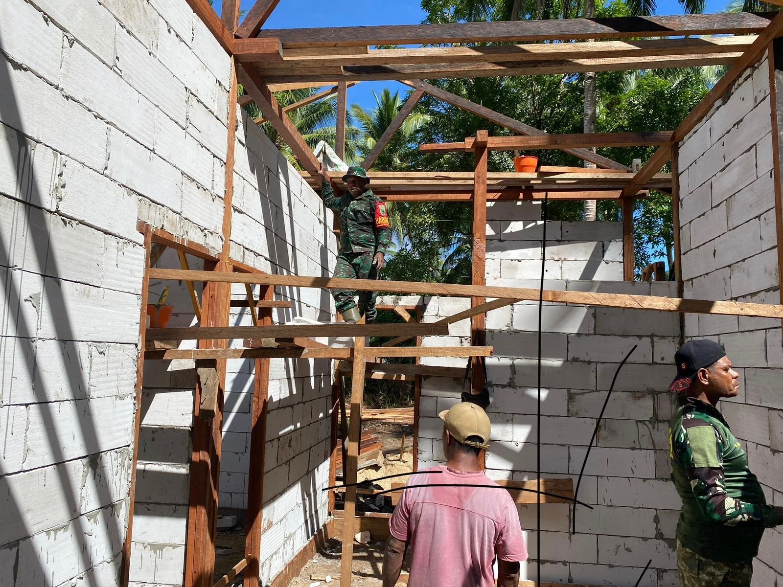 Personel TNI bersama warga tampak kompak menaikkan lembaran seng dan memasangnya ke rangka atap yang telah berdiri kokoh. Proses ini dilakukan dengan cermat untuk memastikan atap terpasang kuat dan rapi.