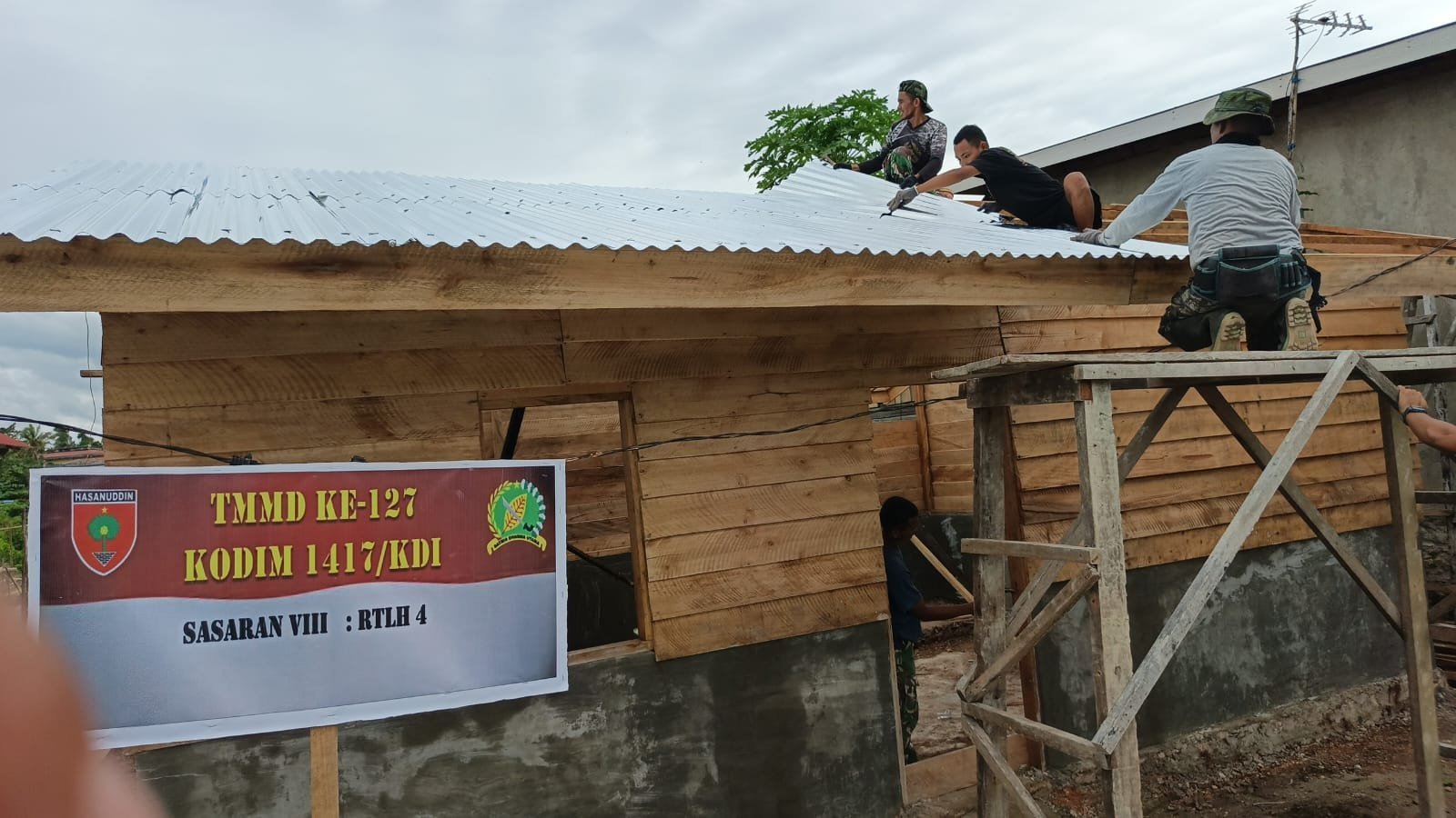 KENDARI – Memasuki tahap akhir konstruksi, Satgas TMMD ke-127 dari Kodim 1417/Kendari mulai melaksanakan pemasangan atap seng pada RTLH unit ke-4 di Kelurahan Petoaha, Rabu (4/3).