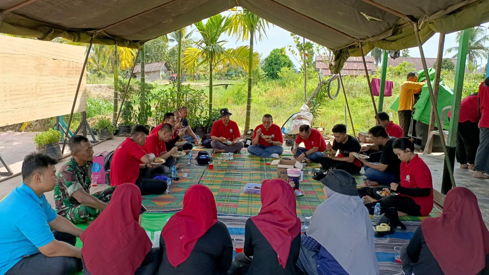 Mempawah — Kebersamaan yang hangat dan penuh keakraban tampak jelas dalam suasana makan bersama antara anggota Satgas TMMD Reguler ke-124, mahasiswa Universitas Tanjungpura (Untan), dan masyarakat Desa Sungai Purun Kecil.